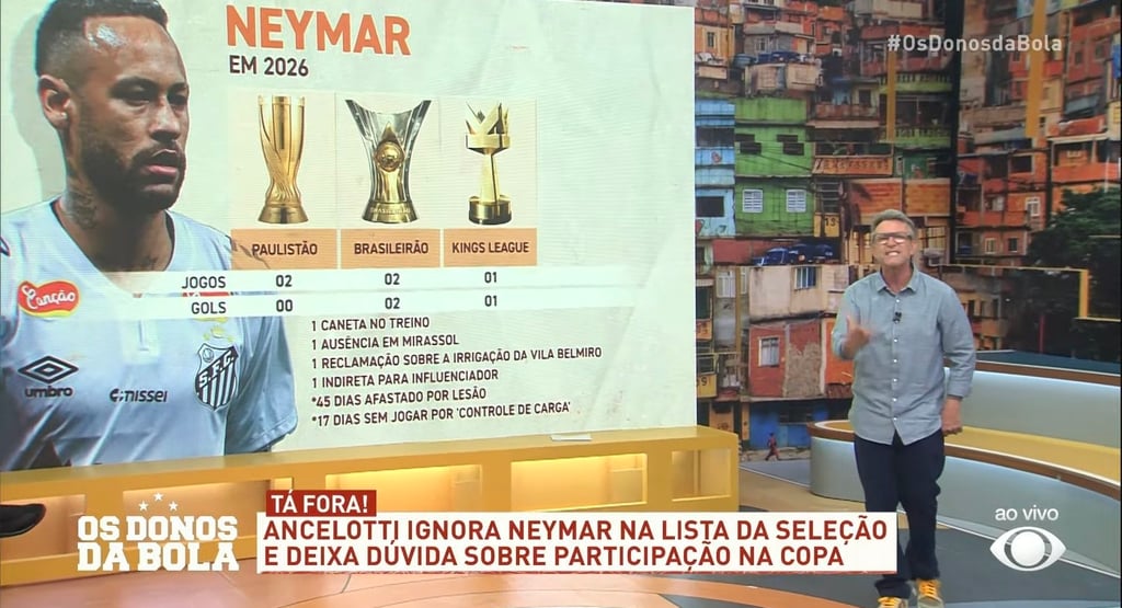 O comentarista Craque Neto, durante o programa Os Donos da Bola (Band), não poupou críticas ao atacante Neymar nesta terça-feira (17). Em uma análise acalorada, o ex-jogador comparou o atual momento do camisa 10 com suas fases de auge e classificou a performance recente como "vergonhosa". Neto afirmou: “Será que esse cara merece ir para a Copa do Mundo? Eu vou botar os números dele daqui a pouco. O Neymar do Barcelona, do PSG, do Santos... ele é o maior jogador depois do Pelé. Mas esse Neymar daqui é vergonhoso!” A declaração veio acompanhada da exibição de estatísticas do jogador em 2026, que, segundo Neto, comprovam a queda de rendimento. O apresentador questionou diretamente a convocação de Neymar para a Copa do Mundo de 2026, que será disputada nos Estados Unidos, Canadá e México, sugerindo que o atacante não estaria em condições físicas ou técnicas ideais para representar a Seleção Brasileira na competição. A fala gerou repercussão imediata nas redes sociais. Perfis como @futebol_info e @OSDONOSDABOLA compartilharam o trecho, com centenas de interações. Alguns torcedores defenderam Neymar, destacando seu histórico de protagonismo na Seleção ao longo de mais de uma década e argumentando que críticas como as de Neto visam apenas gerar cliques. Outros concordaram com o comentarista, apontando atuações recentes apagadas, erros de passe e falta de ritmo em jogos pelo Santos. Neymar, que retornou ao Santos em 2025 após passagens por Barcelona, PSG e Al-Hilal, tem enfrentado críticas recorrentes sobre sua forma física e consistência em campo ao longo da temporada atual. Neto já havia feito comentários semelhantes em outras ocasiões, especialmente após derrotas do clube paulista. A proximidade da Copa do Mundo aumenta o debate sobre a possível convocação do jogador pela comissão técnica da Seleção Brasileira. Resta saber se os números e o desempenho em campo nos próximos meses mudarão a opinião de críticos como Neto — ou se o ex-craque manterá sua posição dura. Rede Bandeirantes