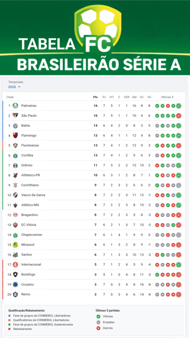 A 71ª edição do Campeonato Brasileiro Série A está em pleno vapor desde 28 de janeiro de 2026 e já entrega emoção desde o apito inicial. Com o calendário antecipado pela CBF, o torneio vai até 2 de dezembro, com pausa obrigatória entre 11 de junho e 19 de julho por conta da Copa do Mundo de 2026 (Canadá, EUA e México). Até o momento, foram disputadas cerca de 66 partidas, com 178 gols marcados (média de 2,7 por jogo) e público total superior a 1,1 milhão de torcedores (média de 19.343 por partida).53d46b O regulamento segue o sistema de pontos corridos em turno e returno (38 rodadas), com critérios de desempate tradicionais (vitórias, saldo de gols, gols pró, confronto direto etc.). Entre as novidades aprovadas pela CBF: limite de transferências subiu para 12 jogos por jogador, até nove estrangeiros por súmula e VAR em todos os jogos (custas pagas pela entidade). A classificação para a Libertadores 2027 também mudou: os quatro primeiros vão direto para a fase de grupos, o 5º entra na preliminar, enquanto a Copa do Brasil garante duas vagas extras (campeão na fase de grupos e vice na preliminar). O campeão ainda disputa a Supercopa Rei em 2027.02a8ad Classificação atual (após atualização de 20/03/2026) Palmeiras – 16 pts (7J, 5V-1E-1D, 16 GP-8 GC, +8, 76%) São Paulo – 16 pts (7J, 5V-1E-1D, 10 GP-4 GC, +6, 76%) Bahia – 14 pts (6J, 4V-2E-0D, 8 GP-3 GC, +5, 77%) Flamengo – 13 pts (6J, 4V-1E-1D, 12 GP-4 GC, +8, 72%) Fluminense – 13 pts (7J, 4V-1E-2D, 12 GP-9 GC, +3, 61%) Coritiba – 13 pts (7J, 4V-1E-2D, 9 GP-6 GC, +3, 61%) Grêmio – 11 pts (7J, 3V-2E-2D, 12 GP-10 GC, +2, 52%) Athletico-PR – 10 pts (6J, 3V-1E-2D, 8 GP-7 GC, +1, 55%) Corinthians – 9 pts (7J, 2V-3E-2D, 6 GP-6 GC, 0, 42%) Vasco – 8 pts (7J, 2V-2E-3D, 11 GP-12 GC, -1, 38%) Atlético-MG – 8 pts (7J, 2V-2E-3D, 8 GP-10 GC, -2, 38%) Red Bull Bragantino – 8 pts (7J, 2V-2E-3D, 5 GP-8 GC, -3, 38%) Vitória – 7 pts (6J, 2V-1E-3D, 7 GP-10 GC, -3, 38%) Chapecoense – 7 pts (6J, 1V-4E-1D, 9 GP-9 GC, 0, 38%) Mirassol – 6 pts (6J, 1V-3E-2D, 8 GP-9 GC, -1, 33%) Santos – 6 pts (7J, 1V-3E-3D, 10 GP-13 GC, -3, 28%) Internacional – 5 pts (7J, 1V-2E-4D, 5 GP-9 GC, -4, 23%) Botafogo – 3 pts (5J, 1V-0E-4D, 8 GP-11 GC, -3, 20%) Cruzeiro – 3 pts (7J, 0V-3E-4D, 8 GP-16 GC, -8, 14%) Remo – 3 pts (7J, 0V-3E-4D, 6 GP-14 GC, -8, 14%)974fc0 Destaques da temporada até aqui Surpresas positivas: O Bahia segue invicto e ocupa o G3 com a melhor defesa do campeonato (apenas 3 gols sofridos). O recém-promovido Coritiba brilha no 6º lugar, enquanto Athletico-PR e Chapecoense também mostram força entre os acessos de 2025. Crises: O Botafogo (que vinha de boa fase recente) vive momento delicado na lanterna do G-4 de baixo, com apenas 3 pontos em 5 jogos. Remo, outro promovido, patina na zona de rebaixamento. Cruzeiro ainda não venceu. Goleadas marcantes: Botafogo 4×0 Cruzeiro (1ª rodada) e Palmeiras 5×1 Vitória (2ª rodada). Artilharia (principais) 1º – Carlos Vinícius e Danilo – 5 gols cada 2º – Jonathan Calleri – 4 gols 3º (com 3 gols) – Vitor Roque, Flaco López, Lucho Acosta, Neymar, Gabigol, Allan, Walter Clar, Mendoza, Breno Lopes e outros.6aa5c2 Rotatividade no banco A temporada já viu várias trocas de comando: Tite deixou o Cruzeiro, Cuca assumiu o Santos (após demissão de Vojvoda), Filipe Luís e Leonardo Jardim no Flamengo, mudanças no Atlético-MG, Vasco, Remo e São Paulo. Lesões também marcaram o período, como a grave do lateral Marlon (Grêmio).c3814a Resultados recentes da rodada (18-19/03) incluíram vitórias do Palmeiras sobre o Botafogo (2×1), Bahia sobre o Bragantino (2×0), Atlético-MG sobre o São Paulo (1×0) e virada do Vasco sobre o Fluminense (3×2). A próxima rodada promete mais equilíbrio, com duelos diretos entre times do G6 e da zona de rebaixamento. Com apenas sete rodadas disputadas, o Brasileirão 2026 já mostra que será uma das edições mais imprevisíveis dos últimos anos. Palmeiras e São Paulo lideram, mas o Bahia e o Flamengo seguem no encalço. Os promovidos Coritiba e Chapecoense provam que o acesso não foi por acaso, enquanto gigantes como Botafogo e Internacional precisam reagir rápido. A pausa para a Copa do Mundo será o grande divisor de águas. O título de 2026 ainda está completamente aberto – e a briga só tende a esquentar.